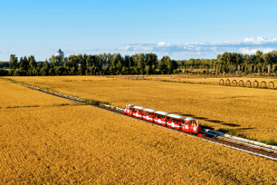 在黑龍江省佳木斯市同江市,旅游小火車在稻田間行駛(無人機(jī)照片)。新華社發(fā)(劉萬平攝)